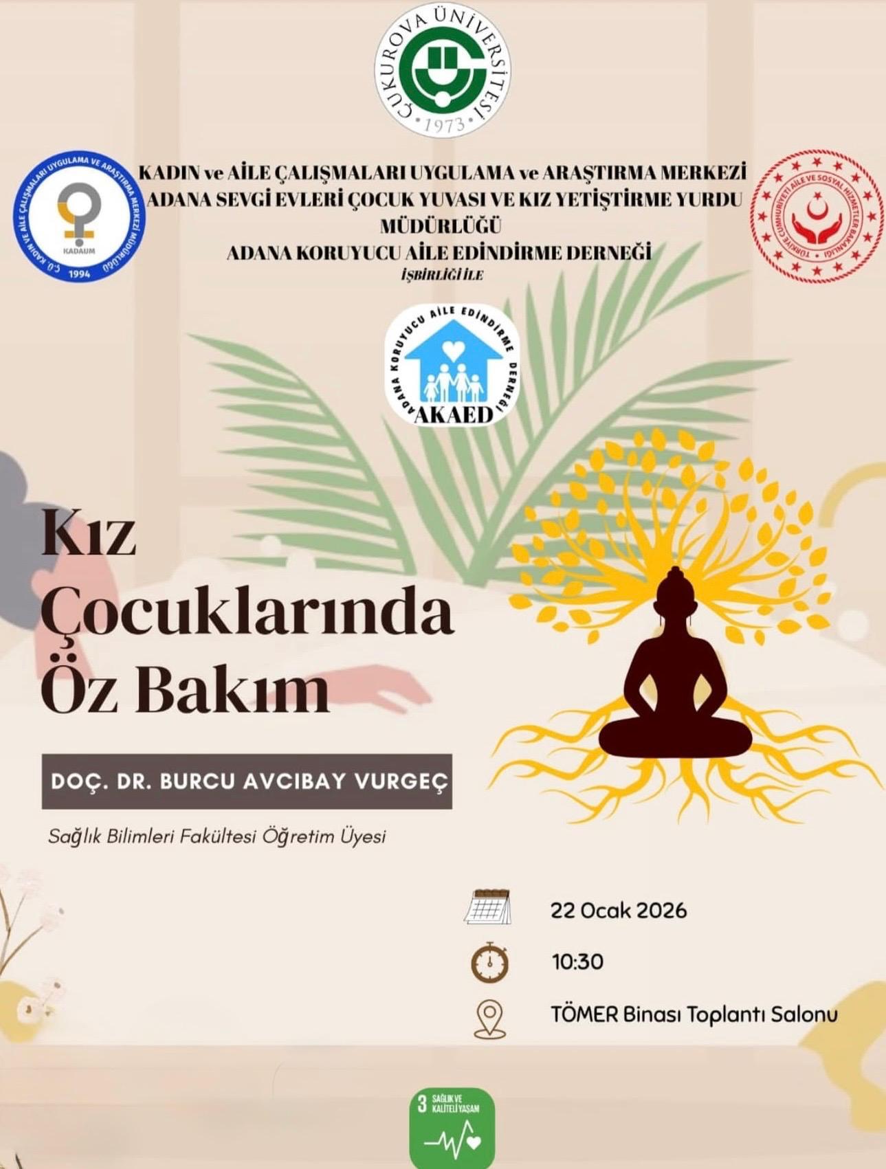 22.01.2026 tarihinde Kadın ve Aile Çalışmaları Uygulama ve Araştırma Merkezi , Adana Sevgi Evleri Çocuk Yuvası ve Kız Yetiştirme Yurdu Müdürlüğü ve Adana Koruyucu Aile Edindirme Derneği işbirliği ile "Menstrüasyon Dögüsü ve Kız Çocuklarında Öz Bakım" konulu eğitim düzenlenmiştir. Sağlık Bilimleri Fakültesi Ebelik Bölüm Başkanı Doç. Dr. Burcu AVCIBAY VURGEÇ tarafından verilen eğitimde kız çocuklarının soruları cevaplanmış, çocuklara hijyen kiti ve hediyeler dağıtılmıştır.